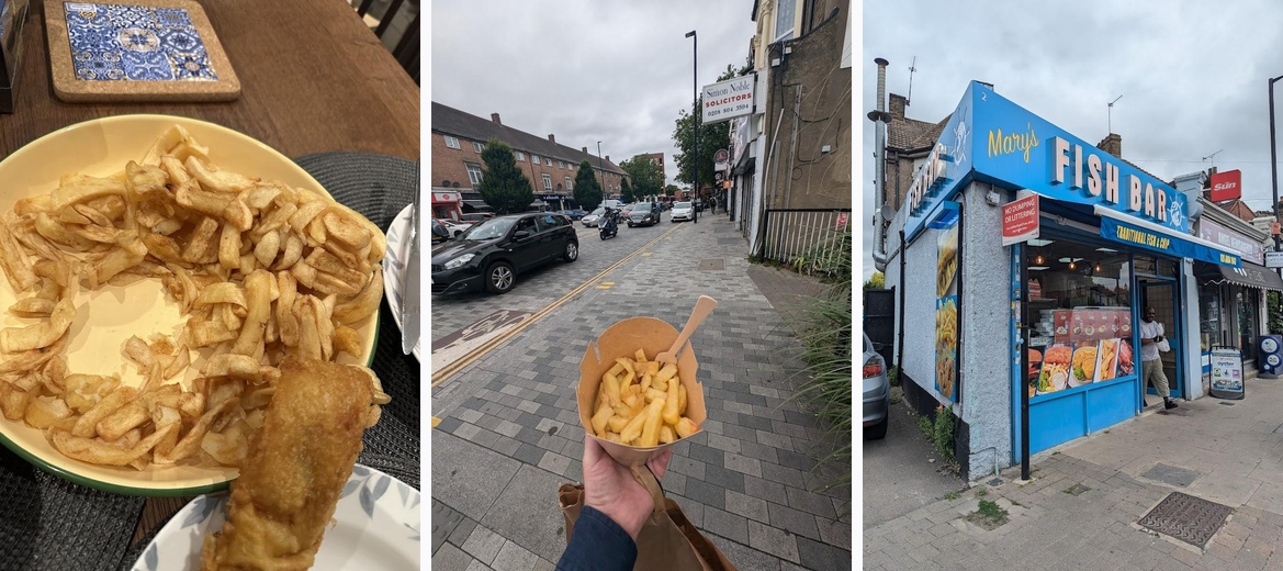 We stopped here for a mid-week meal. It was our first time and we were very impressed with the exceptionally friendly and generous service, and tasty fish and chips. We noticed a board of thank you notes dating back to 1992 - so you know it’s an established chippy (a fish institution) of the area. We ate inside. There is only enough seating for 2-3 people. The fish was cooked to order and they picked out especially large ones for us which was nice. They said if we called ahead the fish can be cooked ready for your arrival. My my this was definitely one of the best fish and chips we have had, and best in London! The size of the fish was incredible, and it was so fresh. Comes with the skin on which I personally like and the peri salt they have for the chips is so good. Mushy peas (homemade) and curry sauce excellent too!
